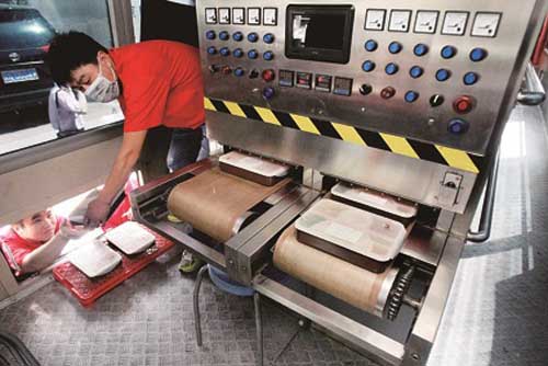 圖為隨著轟隆隆的發(fā)電機(jī)轟鳴,裝載在大巴車(chē)上的盒飯微波加熱機(jī)開(kāi)始運(yùn)轉(zhuǎn)。沒(méi)過(guò)一會(huì)兒,剛才還冷凍的盒飯,一轉(zhuǎn)眼就冒著熱氣出現(xiàn)在傳送帶上。